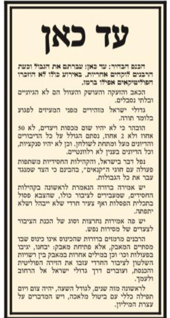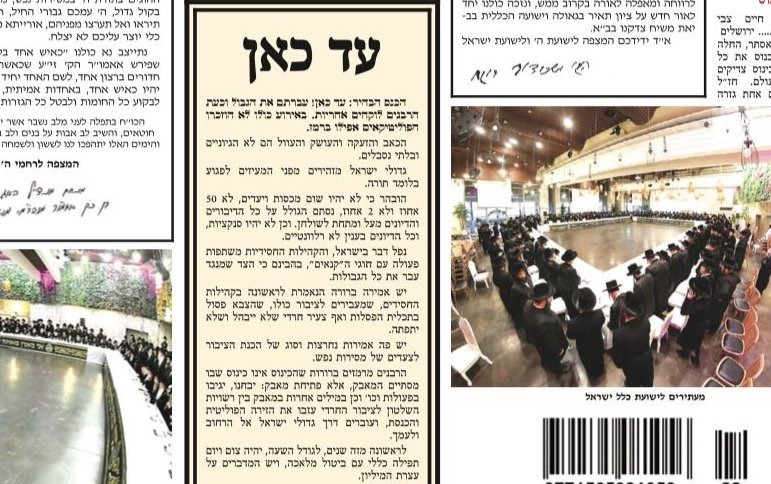 The Hebrew-language Hamodia newspaper, affiliated with the Gerrer chassidus, published a sharply worded notice on Thursday following the historic asifah of Gedolei Yisrael against the conscription of bnei yeshivos on Wednesday evening.