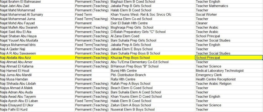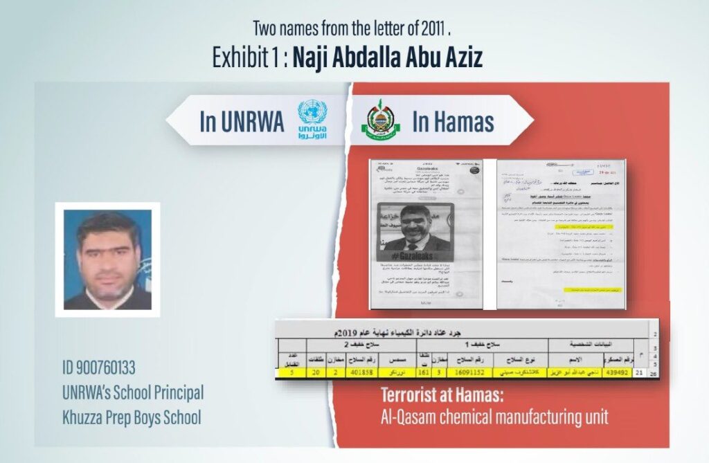 2. Naji Abdalla Abu Aziz—his name was already transferred to the UNRWA in 2011 and again in July 2024—a school principal by day and member of Hamas’ chemical manufacturing unit by night. I revealed information about him several times on my account, and the information was also transferred to UN Relief Coordinator Tom Fletcher, including his Hamas rank and the serial number of his Kalashnikov rifle.