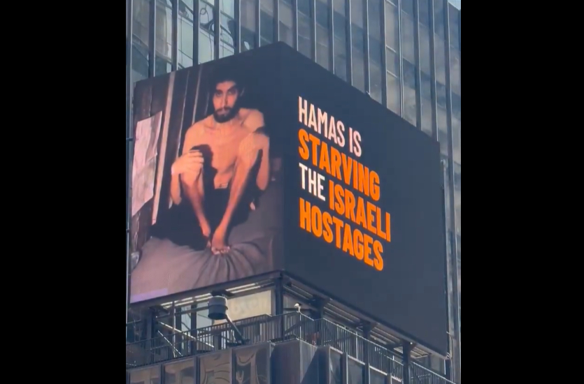 Hamas’s recently published psychological terrorism video of emaciated hostage Evyatar David is being displayed on a large screen, along with captions stating, “Ignored by the media too busy echoing Hamas propaganda” and “Hamas is starving the Israeli hostages.”