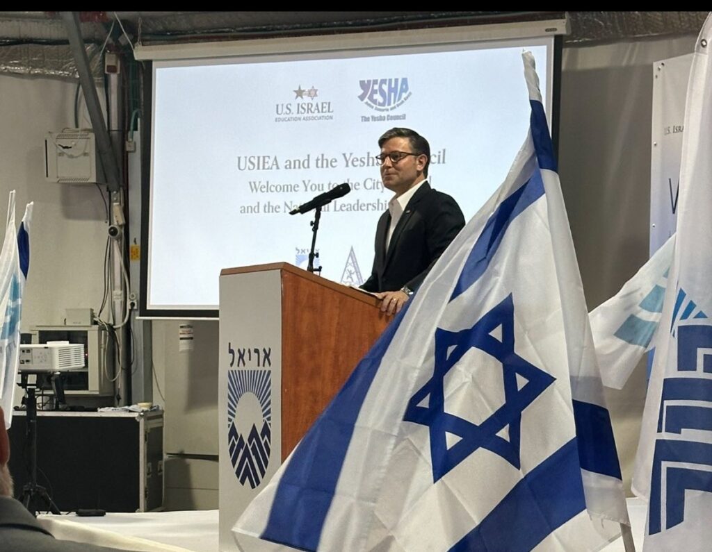 In a previously unannounced visit Monday, U.S. House Speaker Mike Johnson became the highest-ranking American official ever to visit an Israeli settlement in Yehuda and the Shomron, touring the city of Ariel and delivering a strong message of support for Jewish presence in the region.
