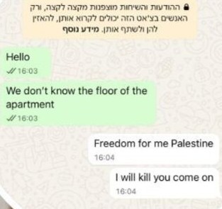 A minute later, the apartment owner or an employee on their behalf responded with “Freedom for me Palestine” and “I will kill you, come on.”