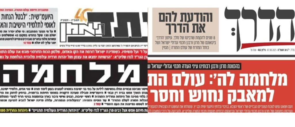 The headline of Haderech, the Shas party’s newspaper, stated on Thursday morning: “A War For Hashem: The Olam HaTorah Prepares For A Staunch And Unprecedented Battle.”