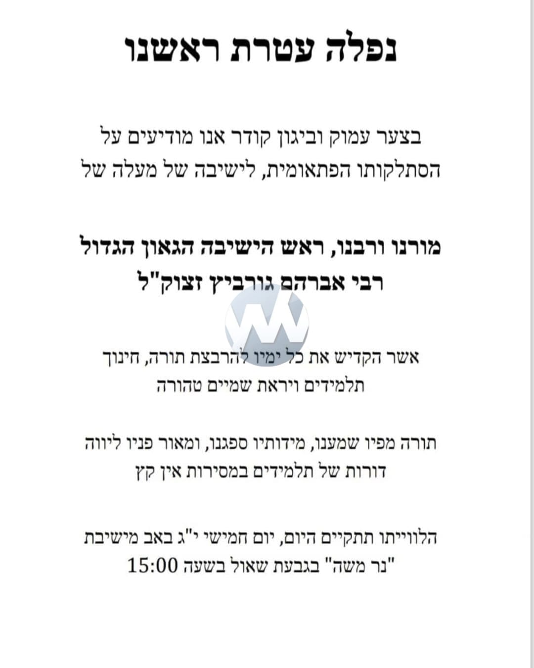 The levayah will take place today, Thursday, 13 Av, at 3:00 PM from Yeshivas Ner Moshe in Givat Shaul, continuing to Har HaZeisim, where kevurah will take place.