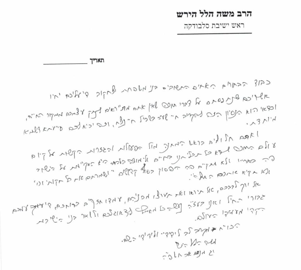 The letter states, “To the esteemed brothers, the sons of the Yitzchakoff family: How fortunate you are that you were ‘caught’ for Torah matters, that you are not afraid to disconnect yourselves from the source of life. This trial is worth sacrificing an hour of life for eternal life, and it will bring you special Siyata Dishmaya.”