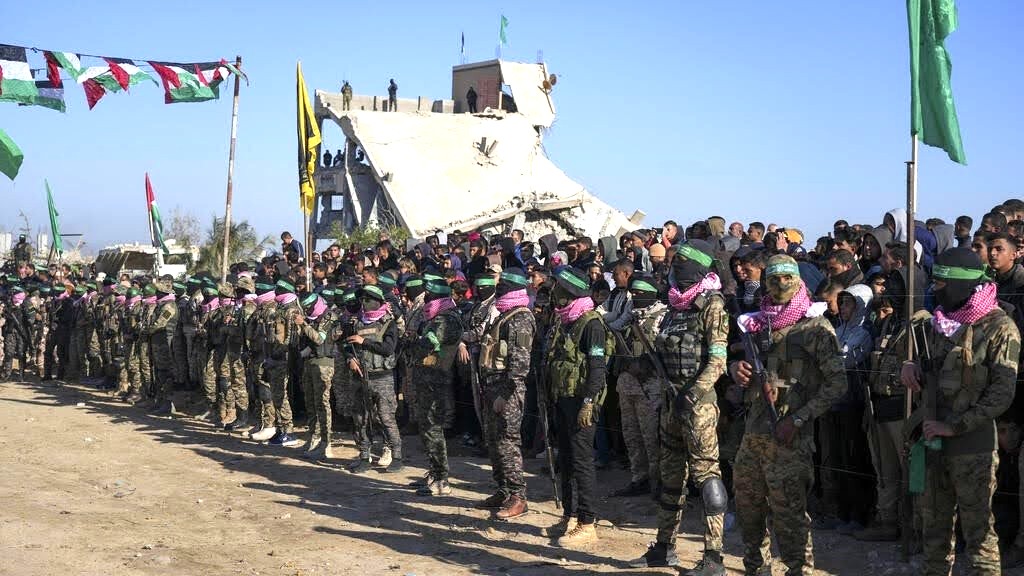 Armed Hamas terrorists in Khan Younis during a hostage release. (Photo: Abdel Kareem Hana/AP)