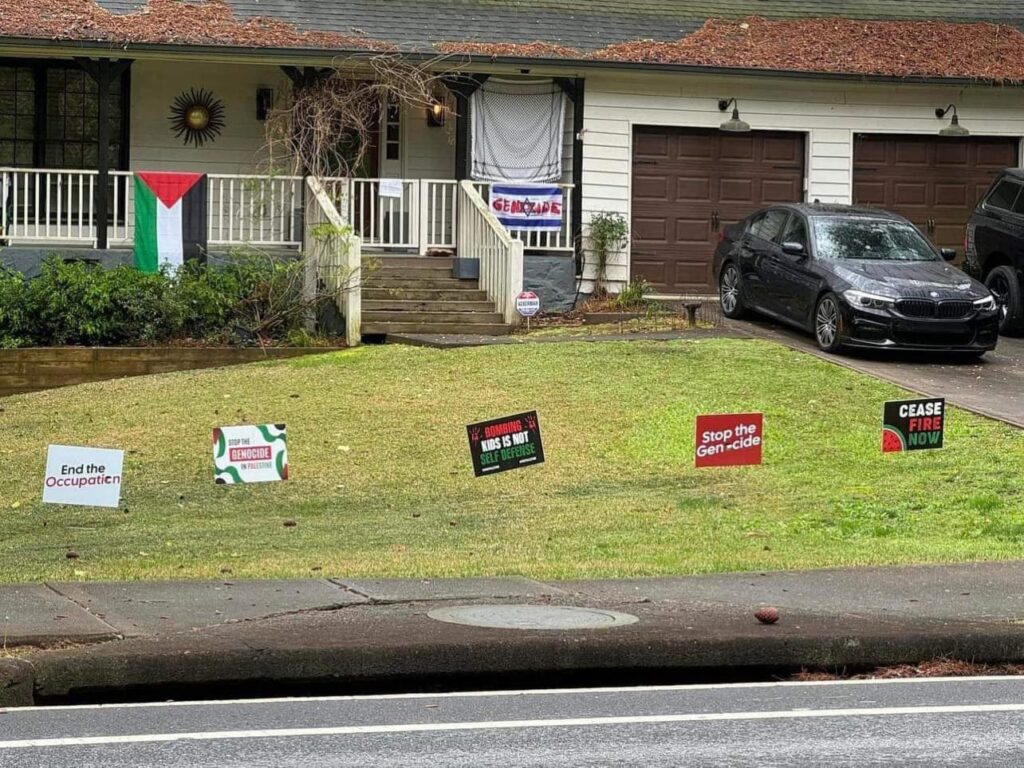 In a disturbing post on Facebook, Lubin shared details of an encounter with a neighbor – Mark and Anna Bouzyk – that turned hateful and aggressive. “This is what antisemitism looks like in real life,” he wrote. “Months ago, my neighbor put a sign in their yard with the slur ‘Kike’ written 21 times. Today, they still keep their pro-Palestine signs up… but rip down my Rose stickers whenever they see them.”
