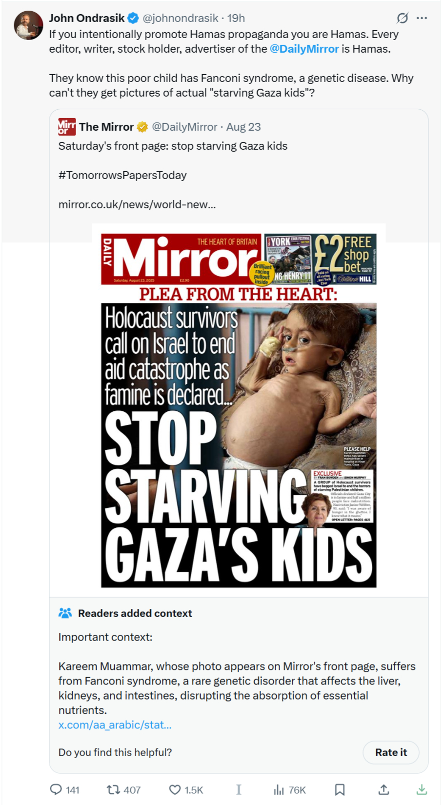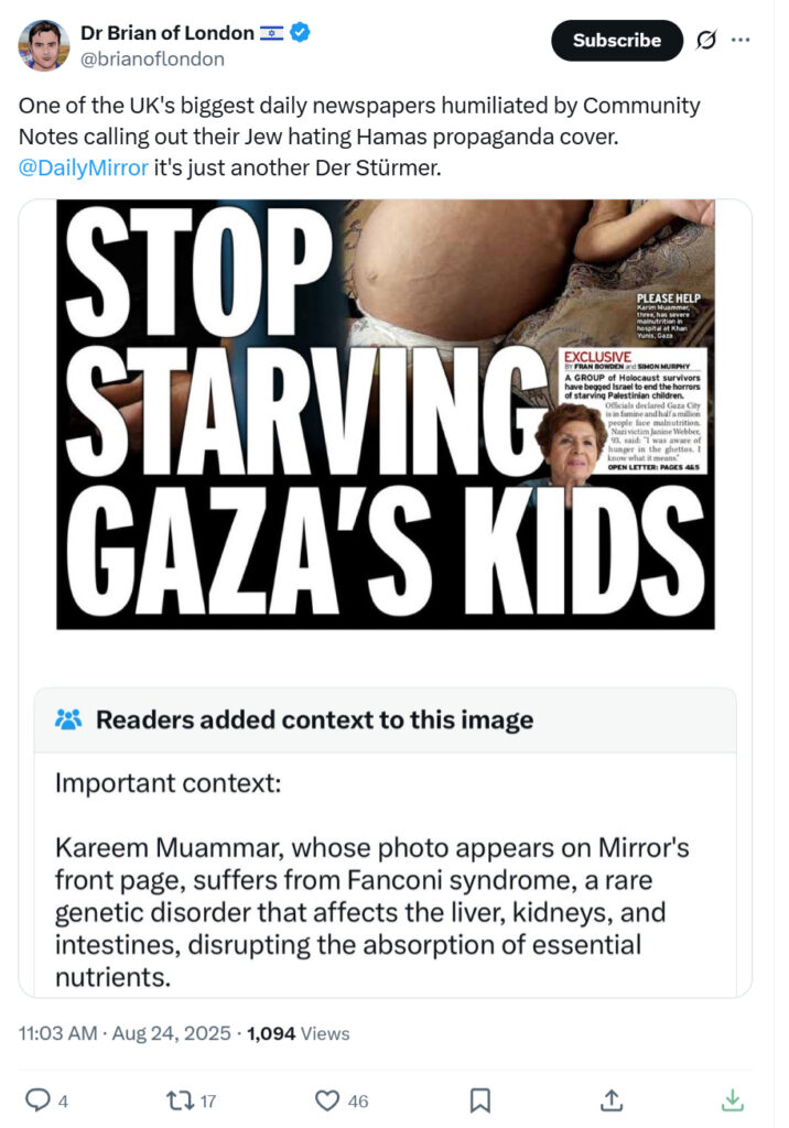 The Camera UK media watchdog group wrote, “What makes this libel so egregious is that the community note, noting the baby’s pre-existing disease, cites a report by Anadolu Agency, the Turkish state-run news agency. The fact that even THEY were more honest than the Daily Mirror is astonishing!”