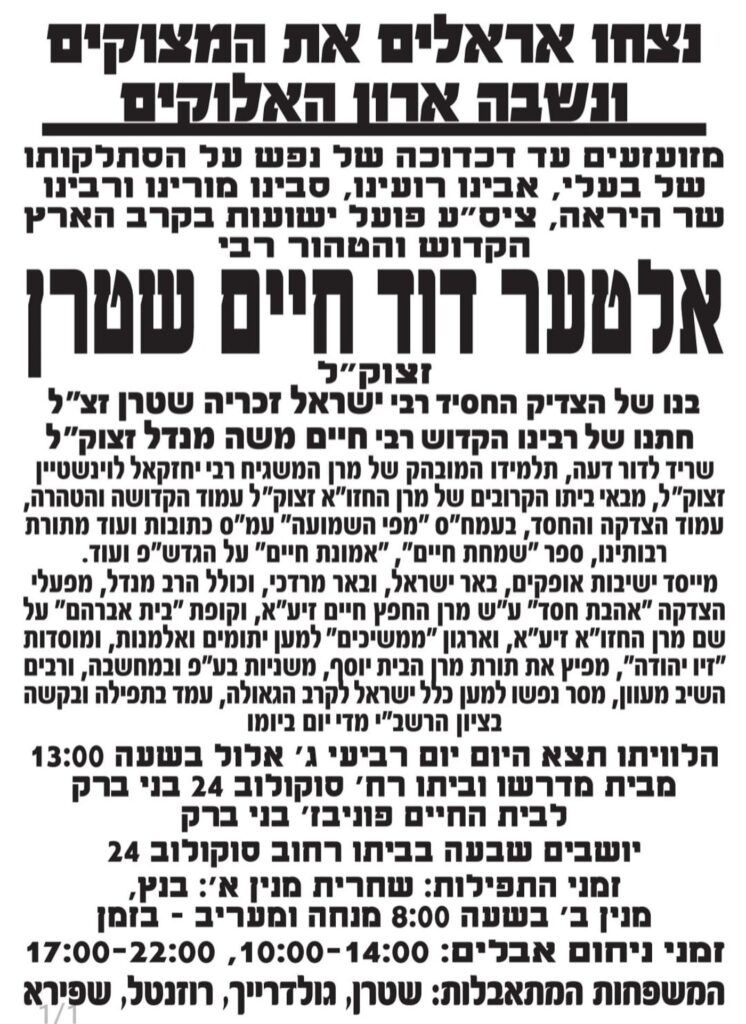 Hamekubal HaTzaddik Rav Altar Dovid Chaim Stern, Z’tl, was niftar early Wednesday morning at Laniado Hospital in Kiryat Sanz in Netanya at the age of 93.