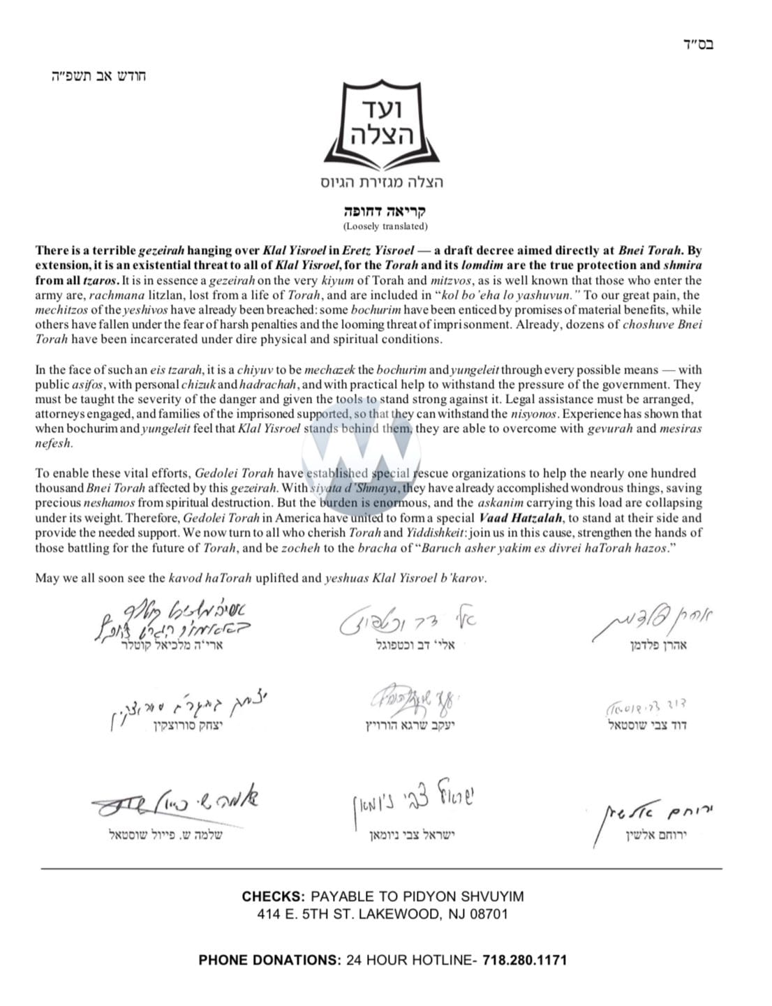 The newly established Vaad Hatzalah will focus on providing both spiritual and practical support. This includes arranging legal assistance, ensuring families of the imprisoned are supported, and giving bochurim the chizuk and hadrachah to withstand these nisyonos. As the Gedolim write, experience has shown that when lomdei Torah feel that Klal Yisroel is behind them, they are able to persevere with gevurah and mesiras nefesh.