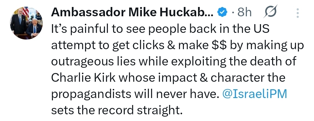 U.S. Ambassador to Israel Mike Huckabee, who reposted Netanyahu’s video on X, added his own comment: “It’s painful to see people back in the U.S. attempt to get clicks & make $$ by making up outrageous lies while exploiting the death of Charlie Kirk whose impact & character the propagandists will never have,” Huckabee wrote. “@IsraeliPM sets the record straight.”