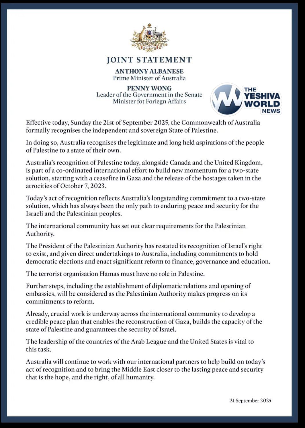 A joint statement issued by the governments of the UK and Australia said, “Effective today, Sunday the 21st of September 2025, the Commonwealth of Australia formally recognizes the independent and sovereign State of Palestine.” It added that the recognition was coordinated with Canada and the UK and reflects “Australia’s longstanding commitment to a two-state solution, which has always been the only path to enduring peace and security for the Israeli and the Palestinian peoples.”