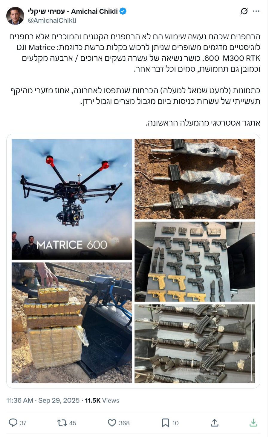 He added that “the drones being used are not the small, familiar models but upgraded logistic drones that can easily be bought online, such as the DJI Matrice 600 or M300 RTK, with a carrying capacity of ten long weapons/four machine guns and, of course, ammunition, drugs, or anything else.”