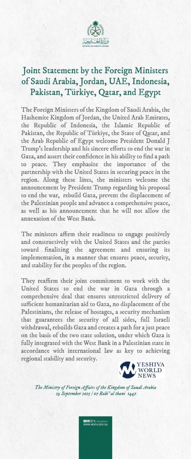 Top diplomats from Saudi Arabia, Jordan, the United Arab Emirates, Indonesia, Pakistan, Türkiye, Qatar and Egypt praised Trump’s “sincere efforts” and said they were confident in his “ability to find a path to peace.”