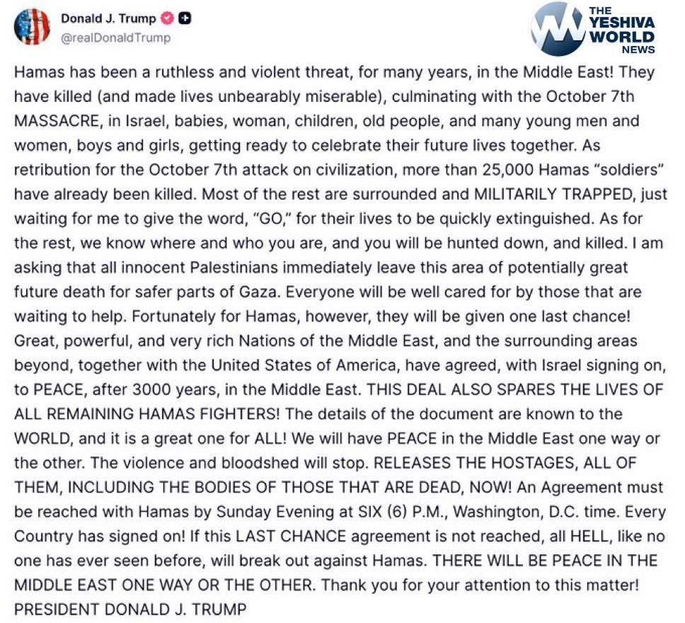 “RELEASE THE HOSTAGES, ALL OF THEM, INCLUDING THE BODIES OF THOSE THAT ARE DEAD, NOW!” Trump wrote. “An Agreement must be reached with Hamas by Sunday Evening at SIX (6) P.M., Washington, D.C. time. Every Country has signed on! … THERE WILL BE PEACE IN THE MIDDLE EAST ONE WAY OR THE OTHER.”