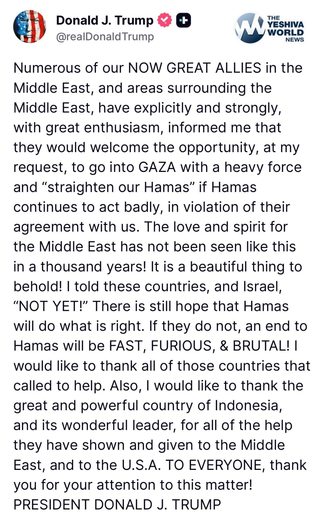 “Numerous of our NOW GREAT ALLIES in the Middle East, and areas surrounding the Middle East, have explicitly and strongly, with great enthusiasm, informed me that they would welcome the opportunity, at my request, to go into GAZA with a heavy force and ‘straighten out Hamas’ if Hamas continues to act badly,” Trump wrote on his social media platform, Truth Social.