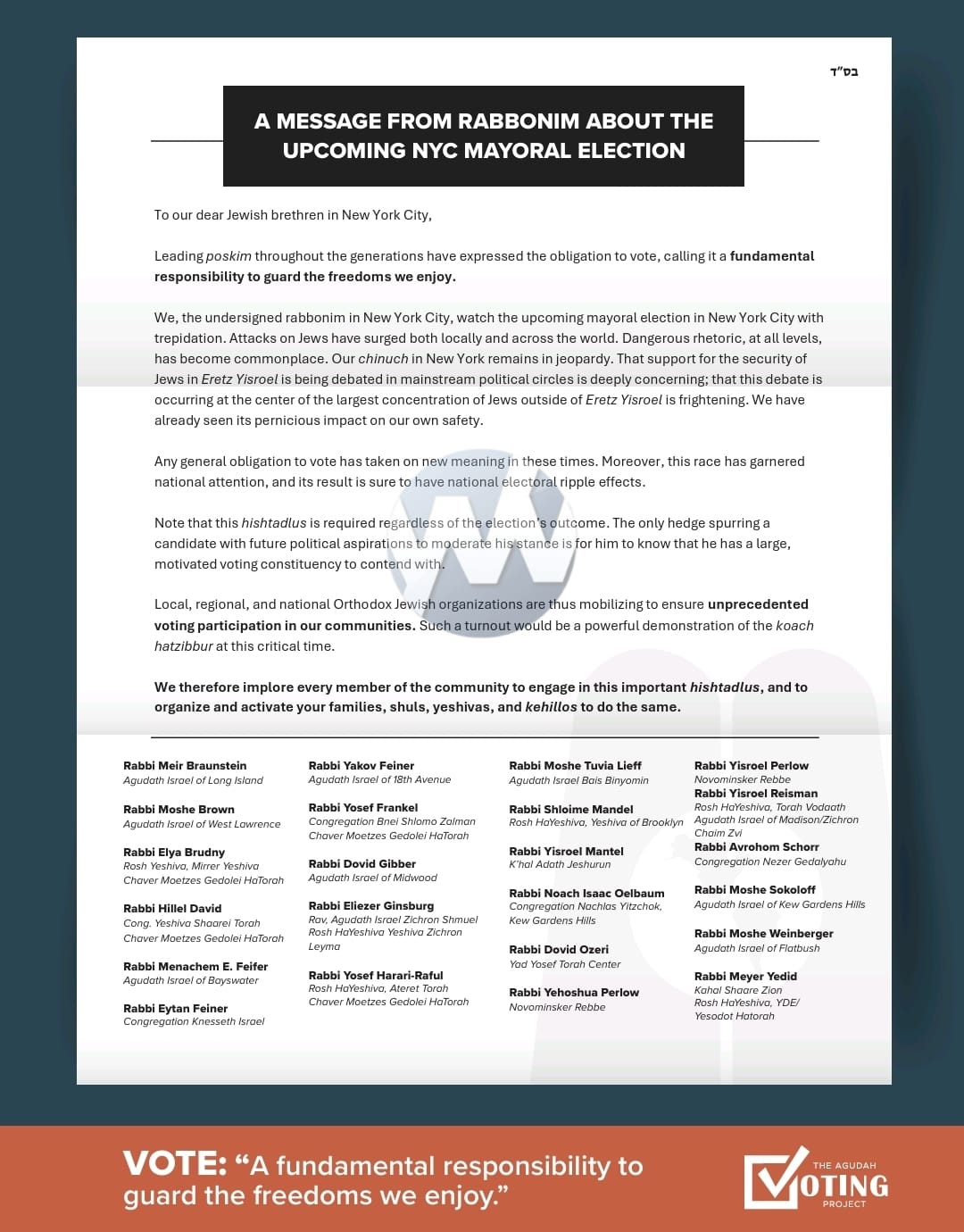 Dozens of rabbonim from across New York City are urging Orthodox Jews to turn out in large numbers for the upcoming New York City mayoral election, calling voting “a fundamental responsibility to guard the freedoms we enjoy.”