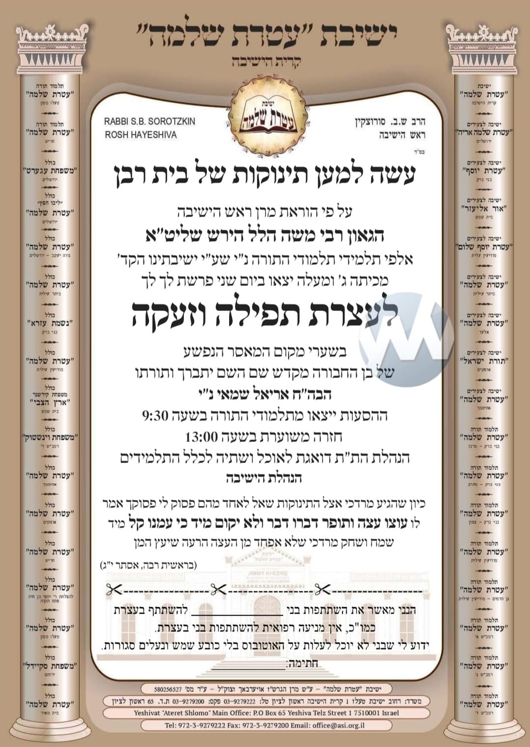 Meanwhile, thousands of children from the Ateres Shlomo Talmudei Torah network are expected to gather Monday outside Prison 10 to protest the arrest — following the directive of HaGaon HaRav Moshe Hillel Hirsch.