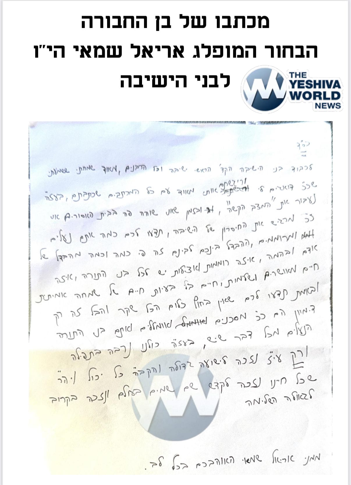 HaRav Sorotzkin then read aloud a letter written by Ariel Shamai from his prison cell to his friends in yeshiva.