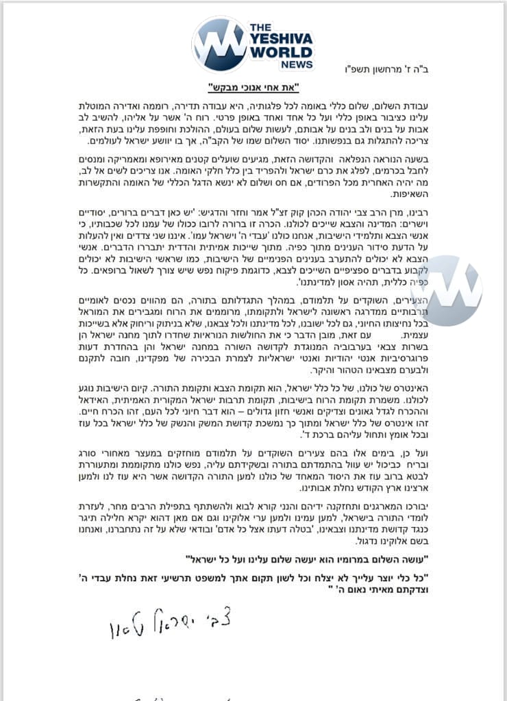 The letter states: “את אחי אנוכי מבקש. The work of peace—true and encompassing peace within the nation, among all its factions—is a constant, elevated, and noble task entrusted to us as a public and to each and every one of us individually.