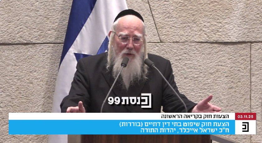 MK Yisrael Eichler spoke today in the Knesset plenum and expressed his ire and disgust with the Israeli judicial system and their persecution of lomdei Torah.