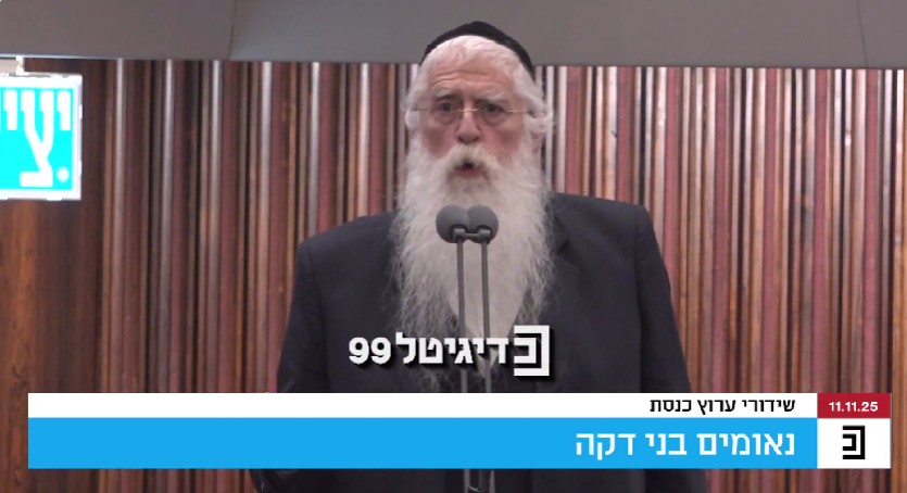 “I’m standing here in the Knesset, the parliament of the Jewish government, and I’m protesting against the harm to lomdei Torah and crying out to the decision-makers—pull yourselves together. You’re playing with fire. Stop—simply stop—persecuting lomdei Torah.”
