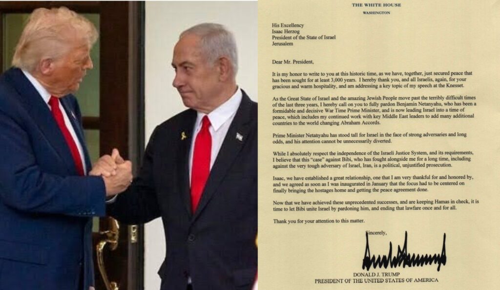 President Isaac Herzog received an official letter from U.S. President Donald Trump on Wednesday morning, calling on him to grant a pardon to Prime Minister Binyamin Netanyahu.