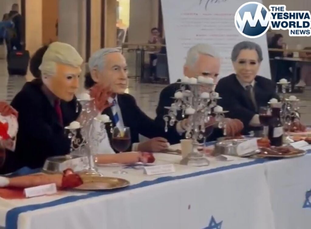 The display featured performers in business suits wearing masks of Israeli Prime Minister Benjamin Netanyahu, President Donald Trump, Sen. Marco Rubio, former President Joe Biden and Secretary of State Antony Blinken. Each figure sat at a long table soaked in fake blood, surrounded by Israeli flags used as napkins, blood-stained doll limbs, glasses of red liquid, and plates resembling organ meat. The table’s printed “menu” listed items such as “Starter: Gaza children’s limbs,” “Main: Stolen organs,” “Dessert: Illegally harvested skin” and “Drink: Gaza’s spilled blood.”