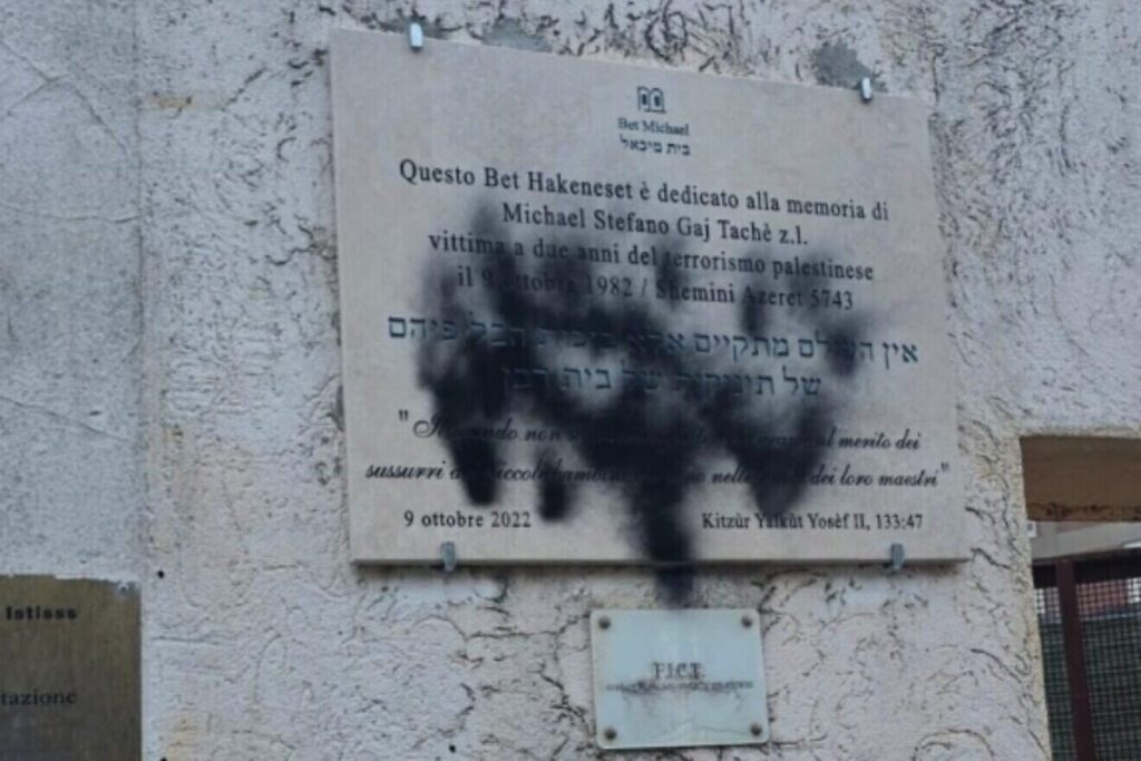 Unidentified perpetrators spray-painted over the plaque honoring Stefano Gaj Taché — the toddler killed in one of Italy’s worst antisemitic attacks since World War II — and scrawled anti-Israel slogans on the walls of the Beth Michael Synagogue, where the memorial was installed.