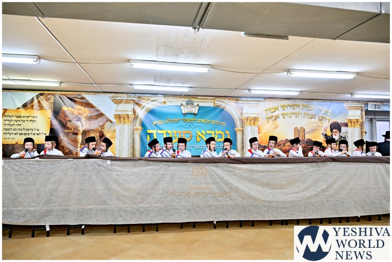 The young talmidim, led by their rebbi Rabbi Eliezer Greenbaum, gathered with great excitement for a beautifully arranged Gemara Seudah, symbolizing the milestone of beginning Talmud study. Parents and grandparents were welcomed to the celebration with joyous music and warm greetings.