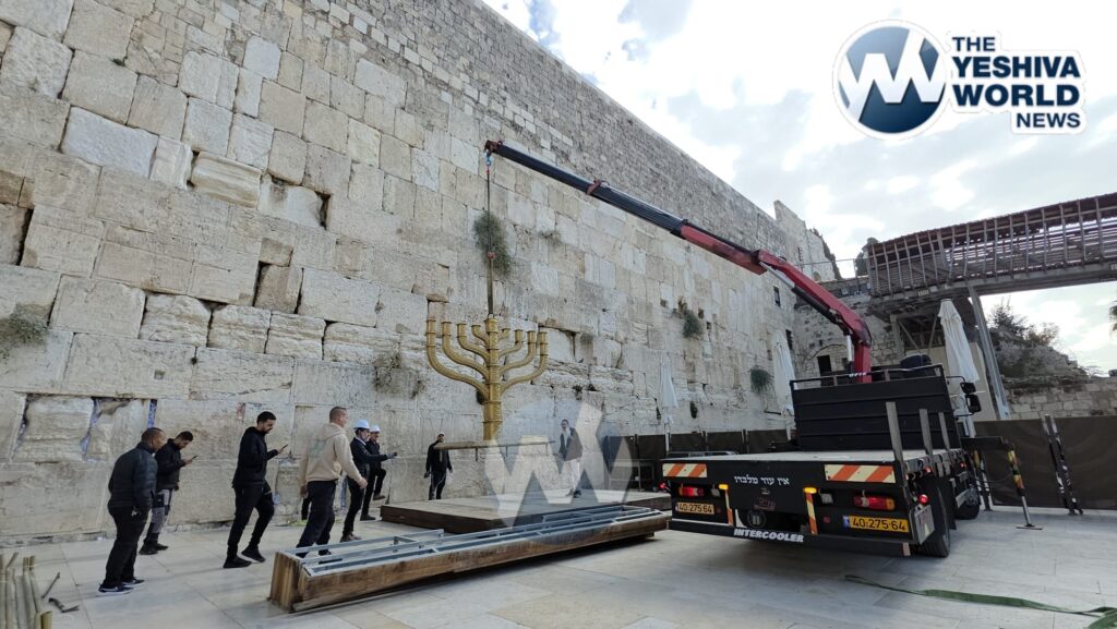 On Sunday morning, the traditional Chanukah menorah was installed in the Kosel plaza. The menorah is crafted entirely from cast bronze, stands more than two meters tall and nearly two meters wide, weighs close to a ton, and took approximately seven months to produce.