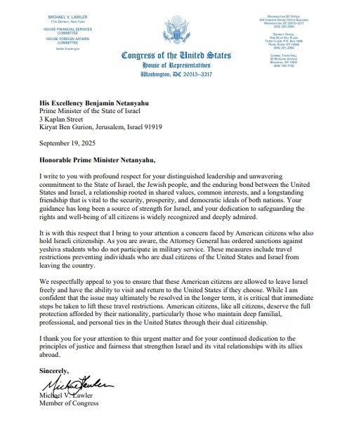 “It is with this respect that I bring to your attention a concern faced by American citizens who also hold Israeli citizenship. As you are aware, the Attorney General has ordered sanctions against yeshiva students who do not participate in military service. These measures include travel restrictions preventing individuals who are dual citizens of the United States and Israel from leaving the country.”