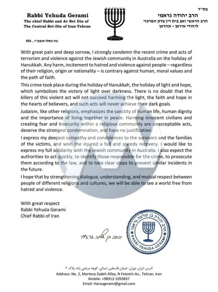 Rabbi Gerami wrote, “With great pain and deep sorrow, I strongly condemn the recent crime and acts of terrorism and violence against the Jewish community in Australia on the holiday of Hanukkah. Any harm, incitement to hatred and violence against people—regardless of their religion, origin or nationality—is contrary to human, moral values and the path of faith.”