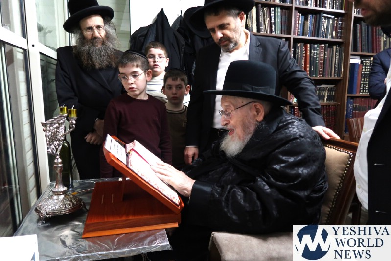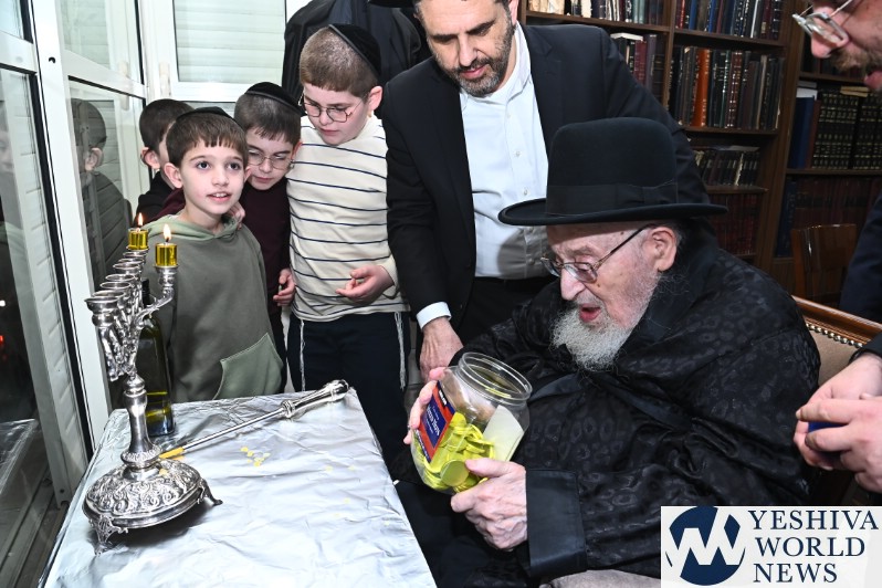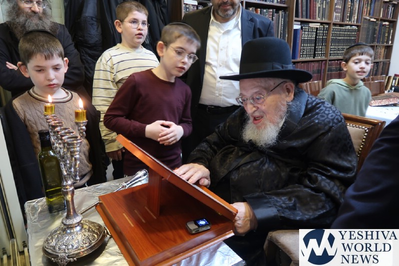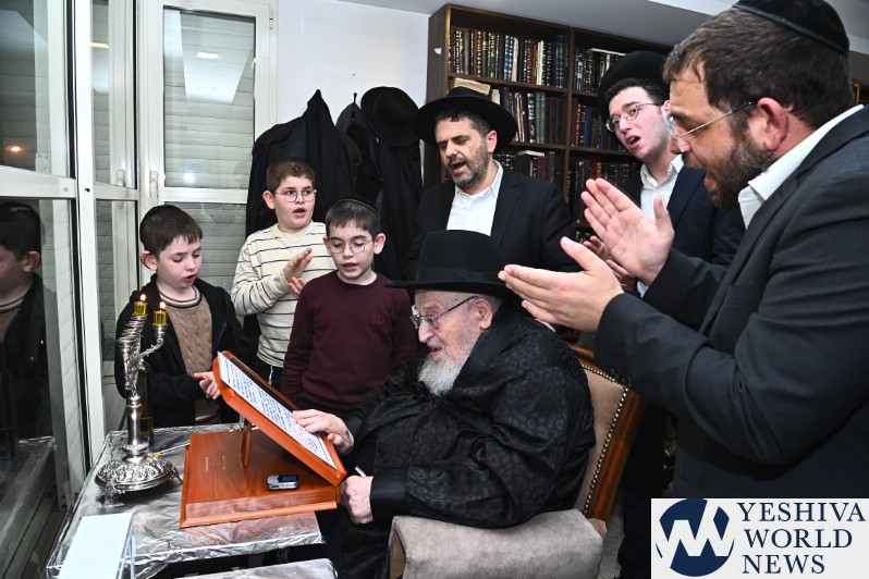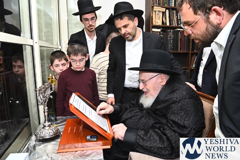 HaGaon HaRav Meir Tzvi Bergman, Zakein Chevrei Moetzes Gedolei Hatorah in Eretz Yisroel on the first night of Chanukah.