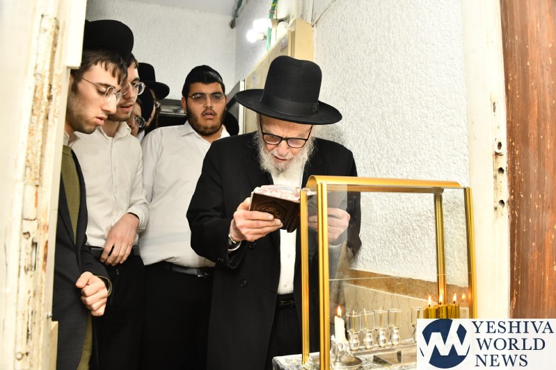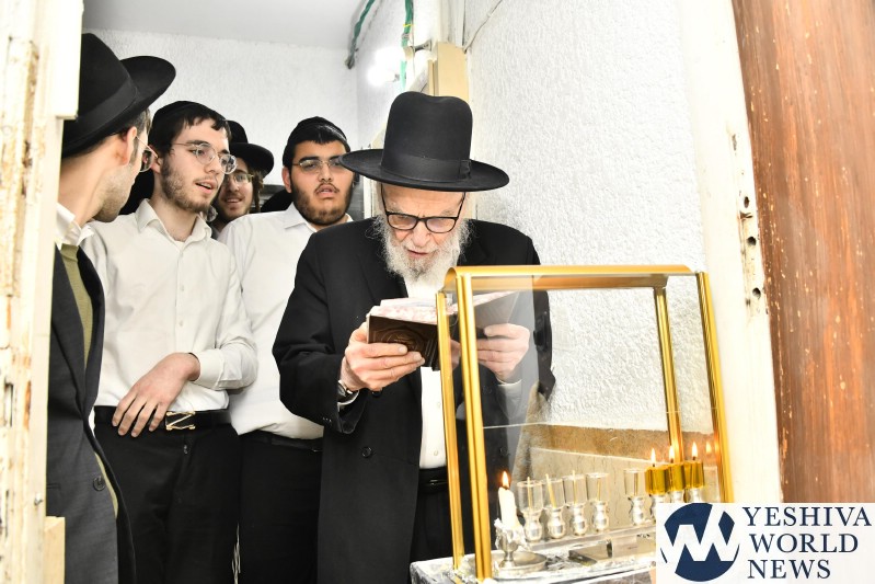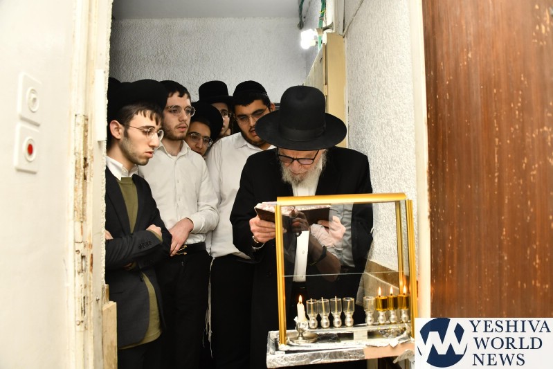 PHOTOS: Hagaon HaRav Moshe Hillel Hirsch Lighting Menorah [Via Shuki Lerer For YWN]