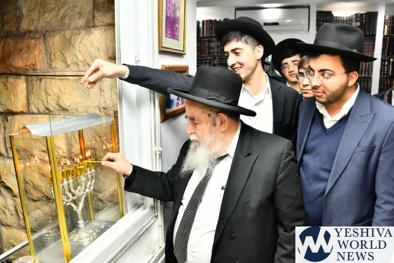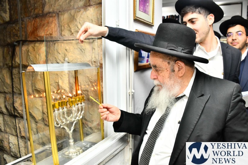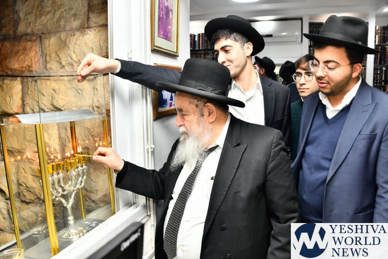 PHOTOS: Hagaon HaRav Avraham Salim Lighting Menorah [Via Shuki Lerer For YWN]