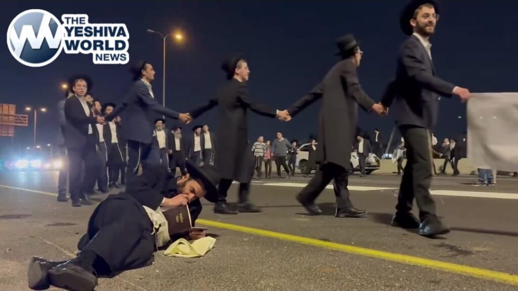 Members of the Peleg Yerushalmi faction, affiliated with the community of Rav Tzvi Friedman, are demonstrating Monday on Route 4 near Bnei Brak, causing severe traffic congestion throughout the area.