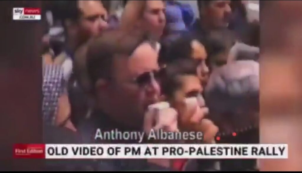 The footage captures a younger Albanese speaking through a megaphone at a protest in Sydney’s Martin Place. Visible beside him is a yellow-and-green Hezbollah banner — representing a group formally listed as a terrorist organization in Australia — along with a sign reading, “Stop the Israeli Slaughter: Free Palestine Now.”