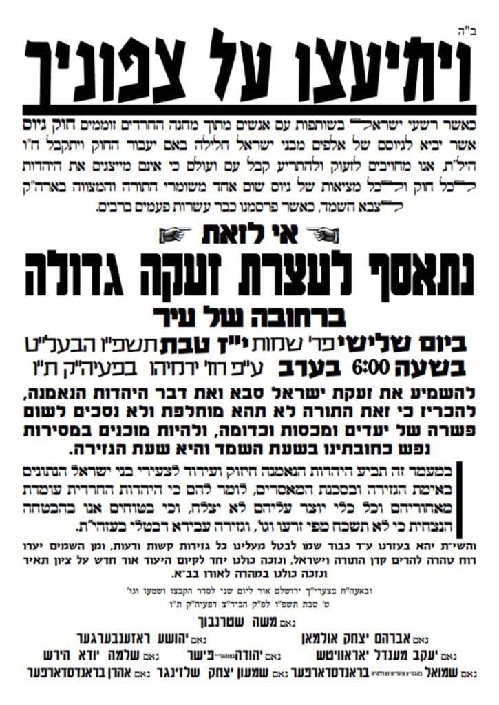 The protest is being held by the Eidah HaChareidis and some of the smaller Chassidish courts. At least one of the Sephardi Gedolim, HaGaon HaRav Ben Tzion Mutzafi, has also called on his talmidim to attend the protest.