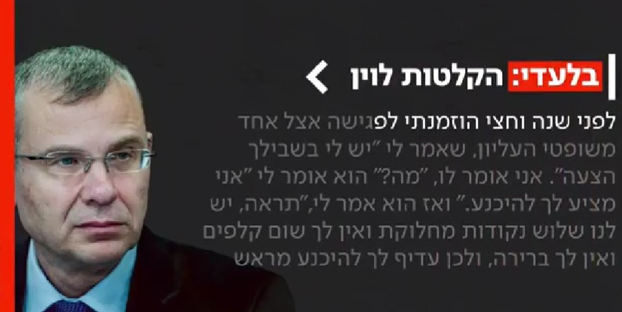 According to a report published Wednesday evening on Kan News, Levin recounted that one of his meetings with a Supreme Court justice focused, among other issues, on the appointment of the Ombudsman for Complaints Against Judges.