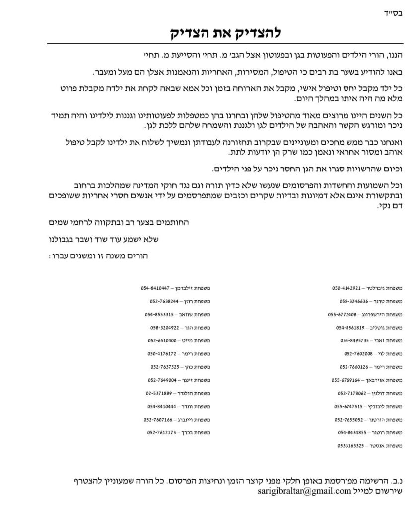 “And all the rumors and suspicions and reports published contrary to Din Torah and against the laws of the state are nothing but lies and delusions published by irresponsible people who are spilling innocent blood,” the letter concludes.