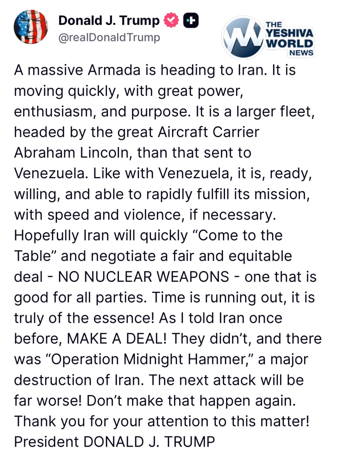“A massive armada is heading to Iran. It is moving quickly, with great power, enthusiasm, and purpose. It is a larger fleet, headed by the great aircraft carrier Abraham Lincoln, than that sent to Venezuela. Like with Venezuela, it is, ready, willing, and able to rapidly fulfill its mission, with speed and violence, if necessary,” Trump wrote on Truth Social.