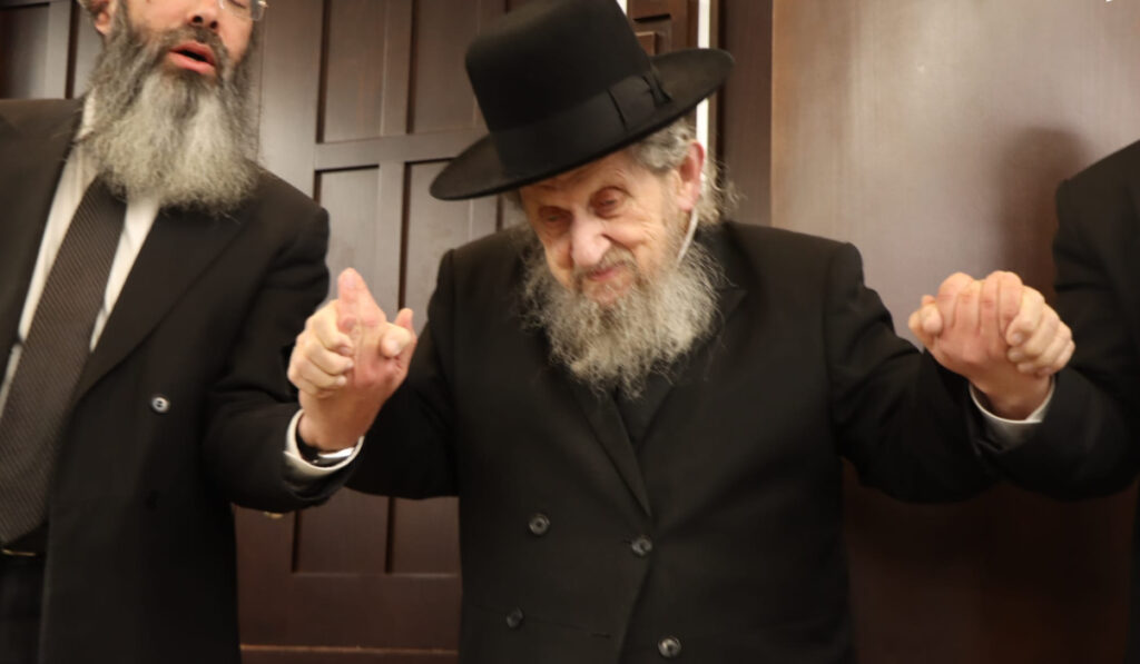 After the shiur, HaRav Landau joined the yeshiva’s Roshei Yeshivos and hundreds of talmidim in a lively dance, singing “Utzu Eitzah VeSufar.”