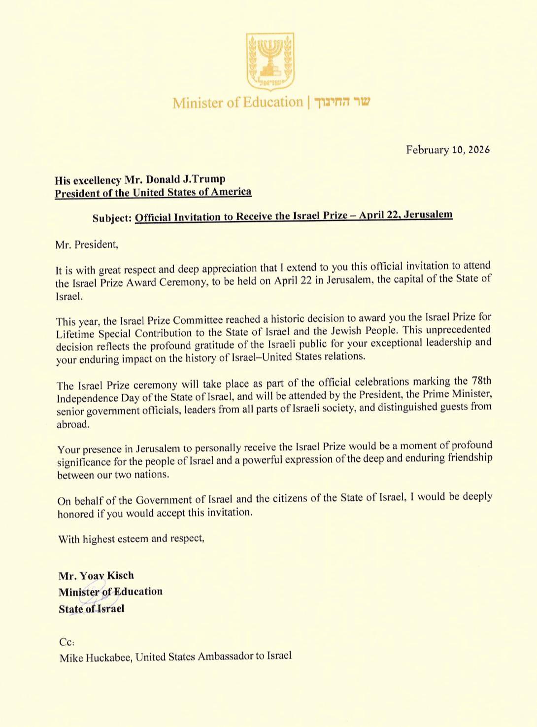 Israeli Education Minister Yoav Kisch has formally invited Donald Trump to attend the Israel Prize Award Ceremony in Jerusalem on April 22, where the U.S. president is set to receive the country’s top civilian honor.