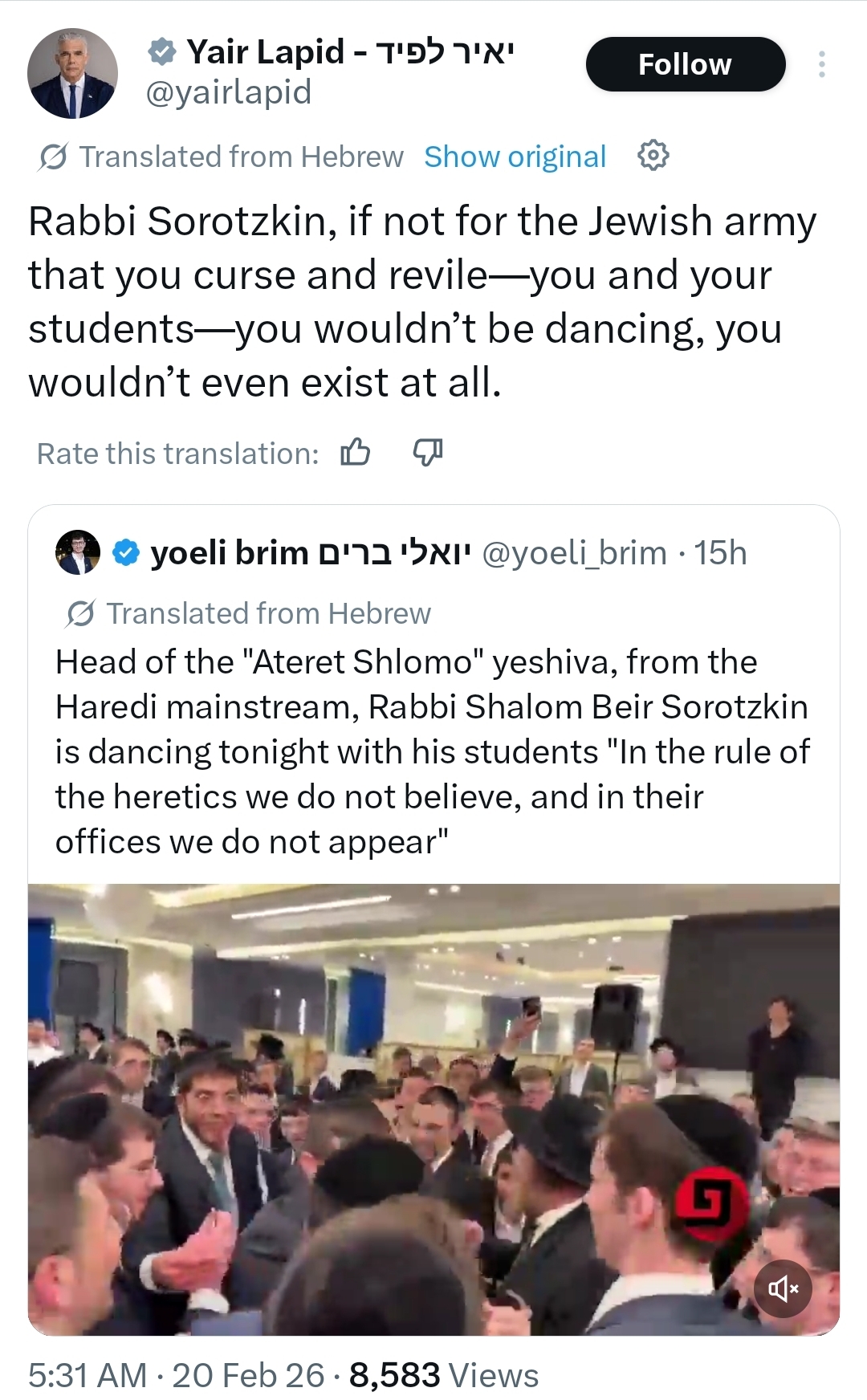 The latest incident quickly drew a furious response from opposition leader Yair Lapid, who shared the video on X and wrote: “Rabbi Sorotzkin, if not for the Jewish army that you insult and curse, you and your students wouldn’t be dancing — you wouldn’t be, at all.”