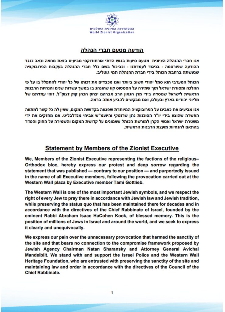 Orthodox executive members of the World Zionist Organization published a statement denouncing an earlier statement that was published by Reform members “in the name of all executive members” without their consent and against their position.