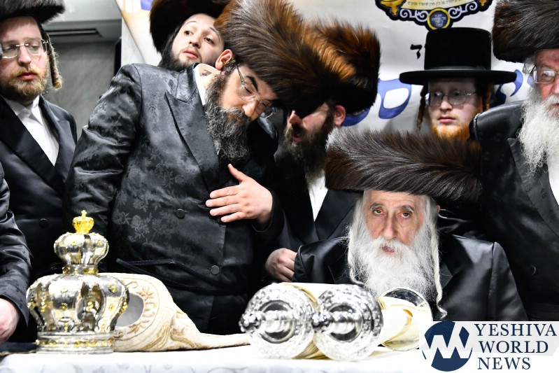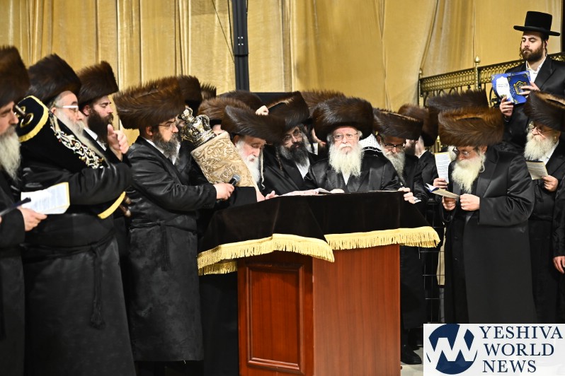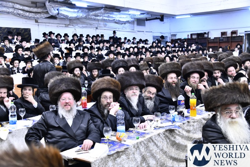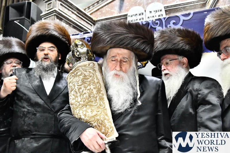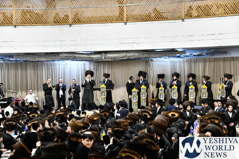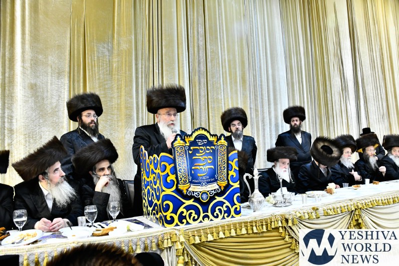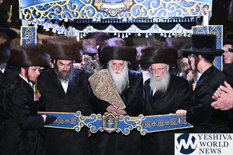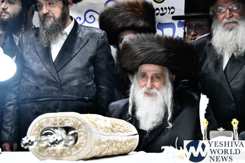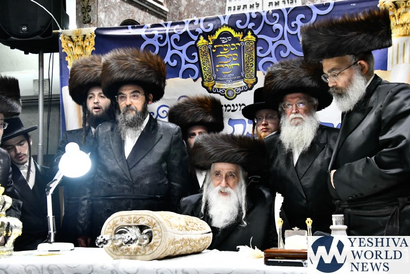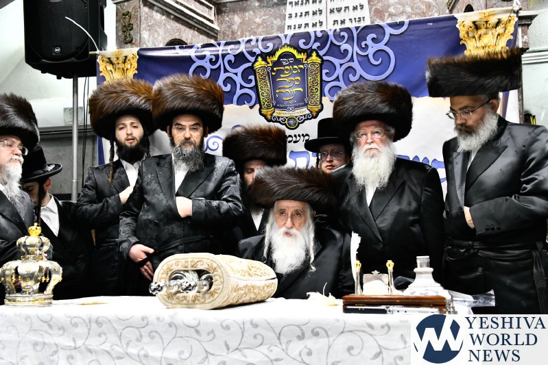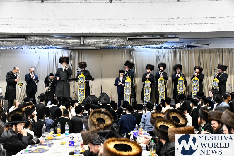 Following the placement of the Sefer Torah into the aron kodesh, the crowd proceeded to a festive seudas mitzvah, which was combined with the central Sheva Brachos celebration for the Rebbe’s grandson.