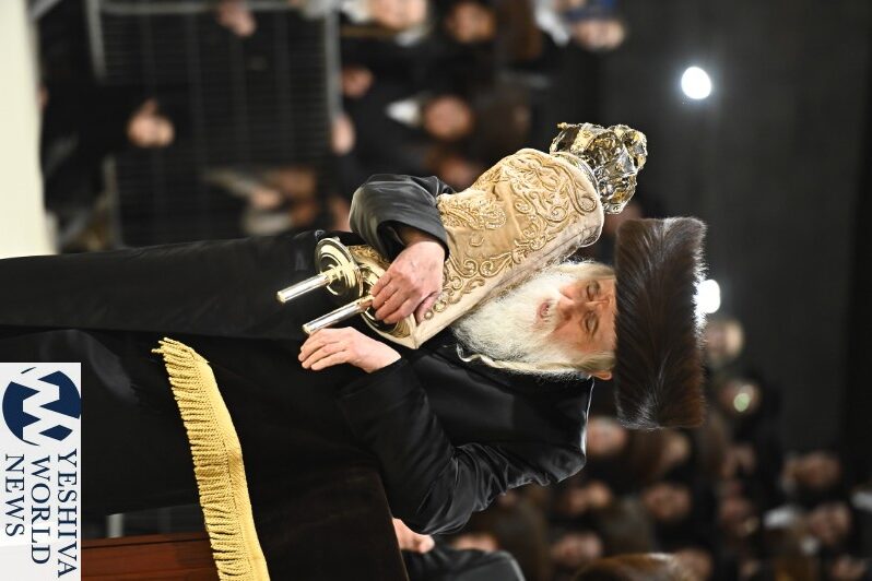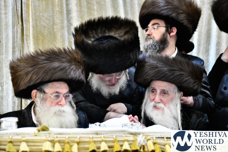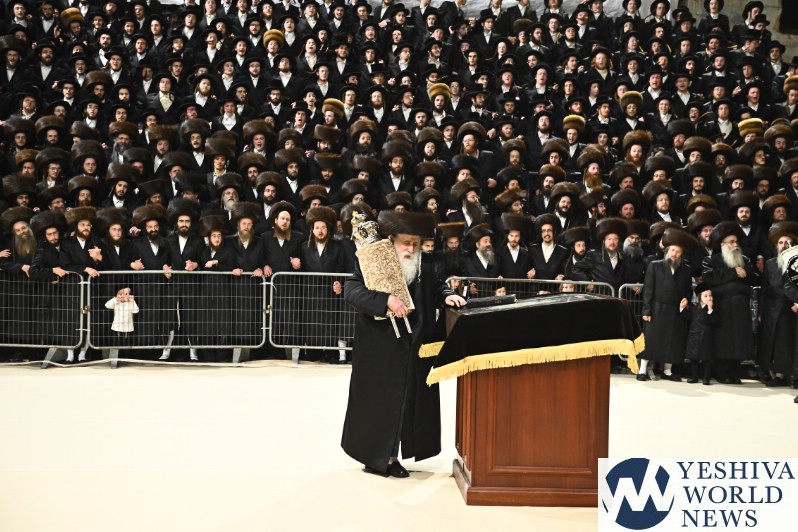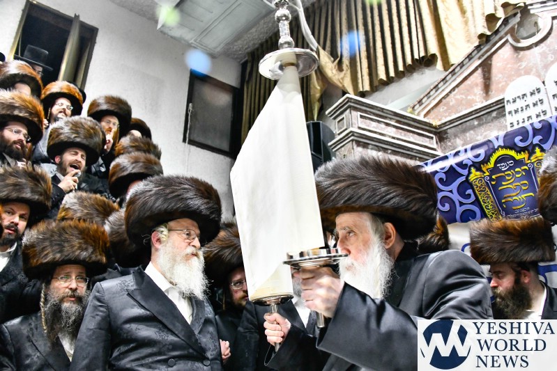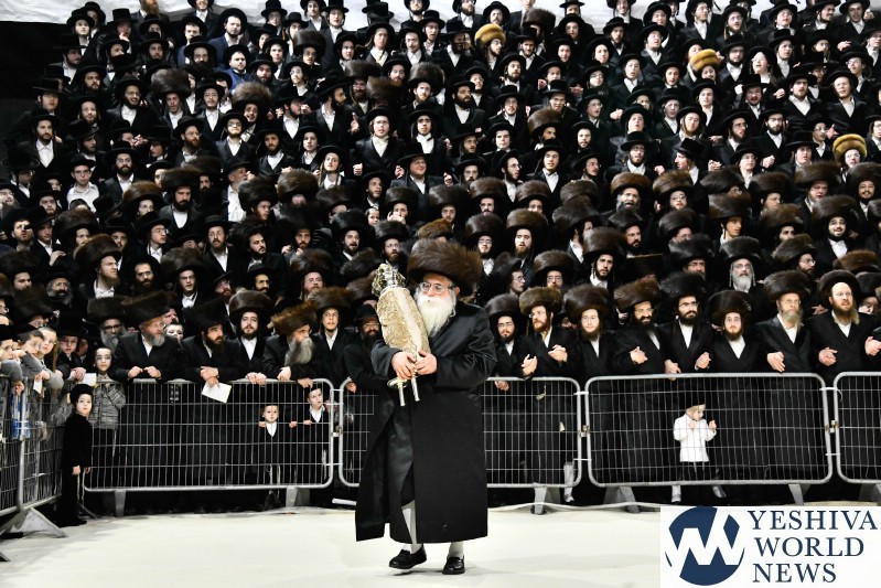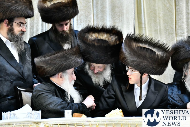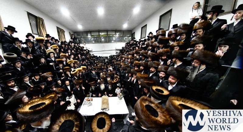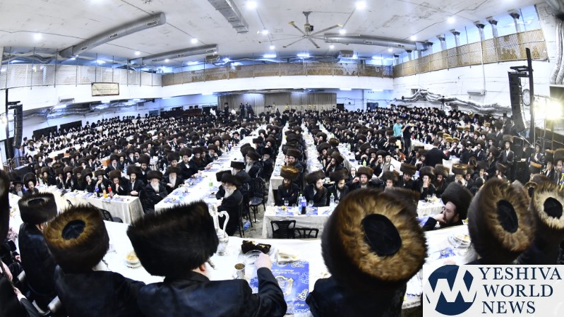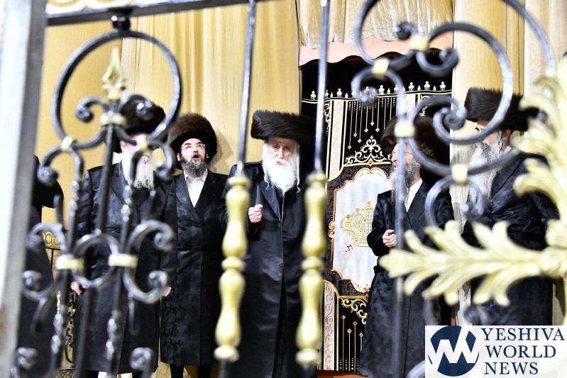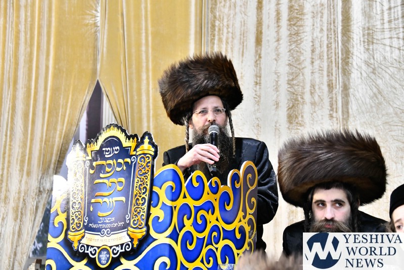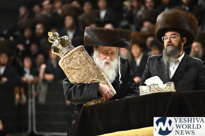Following the placement of the Sefer Torah into the aron kodesh, the crowd proceeded to a festive seudas mitzvah, which was combined with the central Sheva Brachos celebration for the Rebbe’s grandson.
