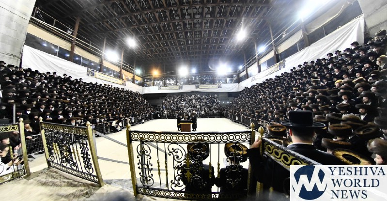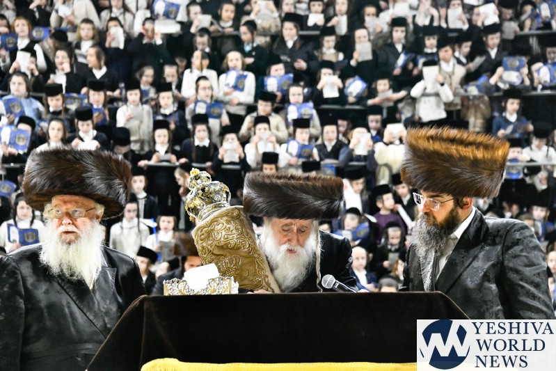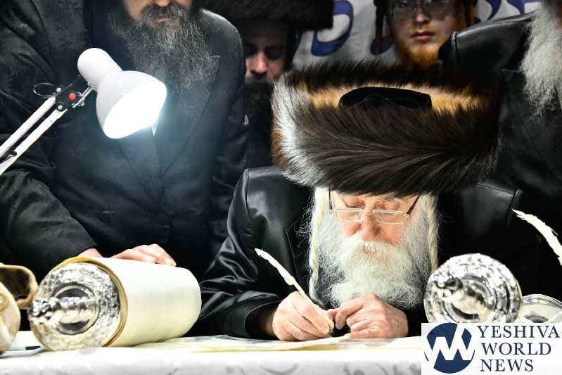 The celebrations began Thursday afternoon with the Siyum Kesivas HaOsiyos in the kollel of the Talmud Torah building on Shelah Street. As the hall could not contain the massive crowd, large outdoor screens were set up to allow the overflow to witness the final letters being written by the Rebbe, rabbanim, and prominent supporters.
