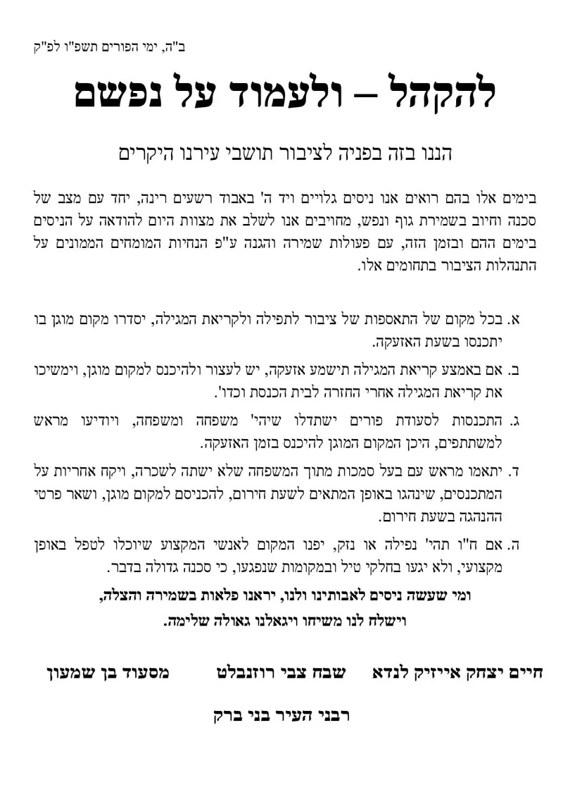 HaGaon HaRav Chaim Yitzchak Isaac Landau, HaGaon HaRav Shevach Tzvi Rosenblatt, and HaGaon HaRav Masoud Ben Shimon published a special letter to city residents entitled “להקהל ולעמוד על נפשם,” emphasizing that despite the many open nissim seen in the city since the war began, residents are mechuyav to heed the guidance of security authorities.