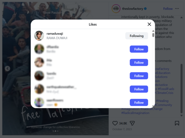 The caption called on supporters to stand with “Palestinian resistance” and featured the slogan “From the river to the sea, Palestine will be free,” a genocidal calling for the elimination of Israel.